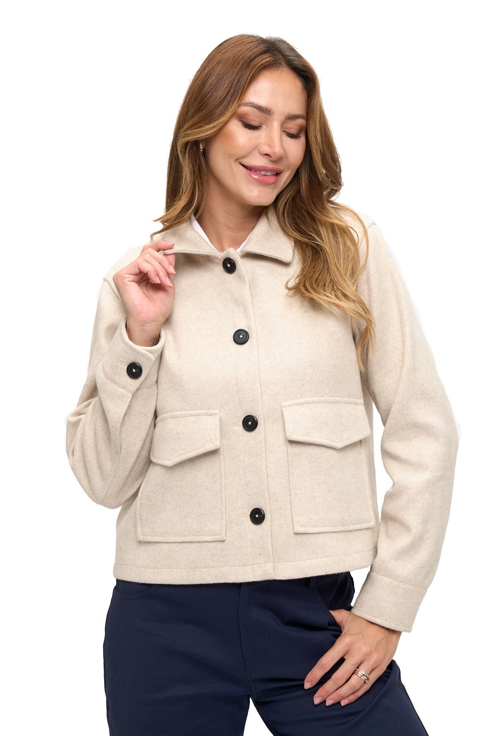 Elevate your outerwear collection with this chic wool-like jacket in a beige hue. Designed for both style and functionality, it features a classic point collar, full button-front closure, and two oversized flap pockets for a modern utilitarian touch. The structured silhouette offers a polished look, while the midweight fabric provides warmth without bulk—perfect for layering through transitional seasons.